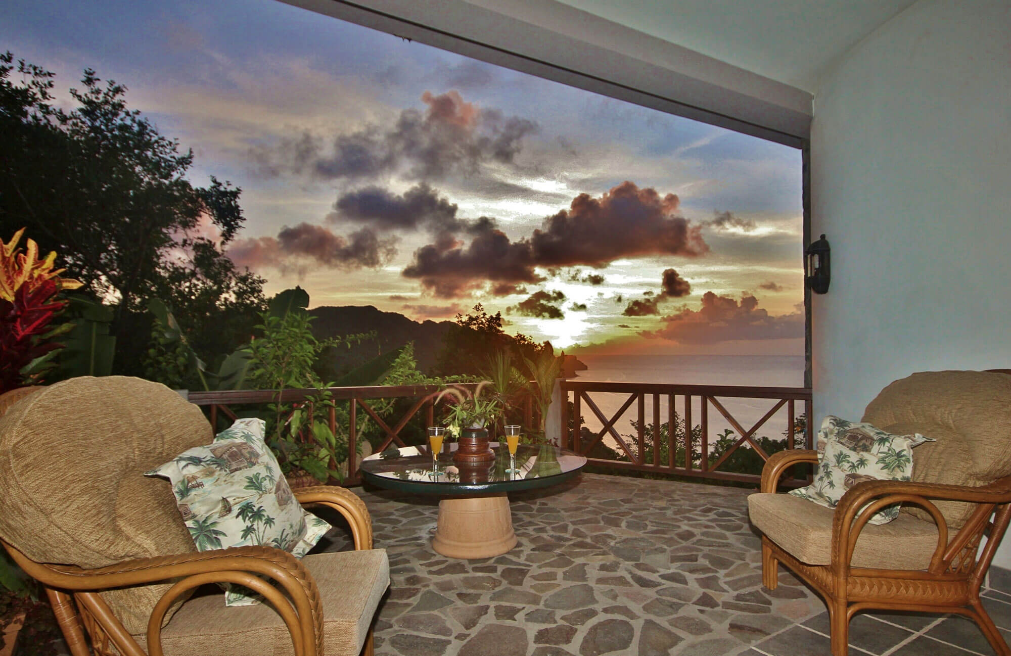 At the far end of the house is a large living area with two comfortable sofas and two captain style cane rocking chairs. This provides a very comfortable seating area and has lovely views looking out through the patio doors. These doors lead onto a covered veranda and patio area with a large swinging hammock, two cane and rattan armchairs, an authentic Thai cartwheel coffee table and a dining table suitable for 4 people. Enjoy Al fresco dining on your own very private veranda and enjoy the ambience of the outside environment with spectacular views overlooking the Caribbean Sea and the surrounding natural forested hills. Sunsets from here can be stunning.