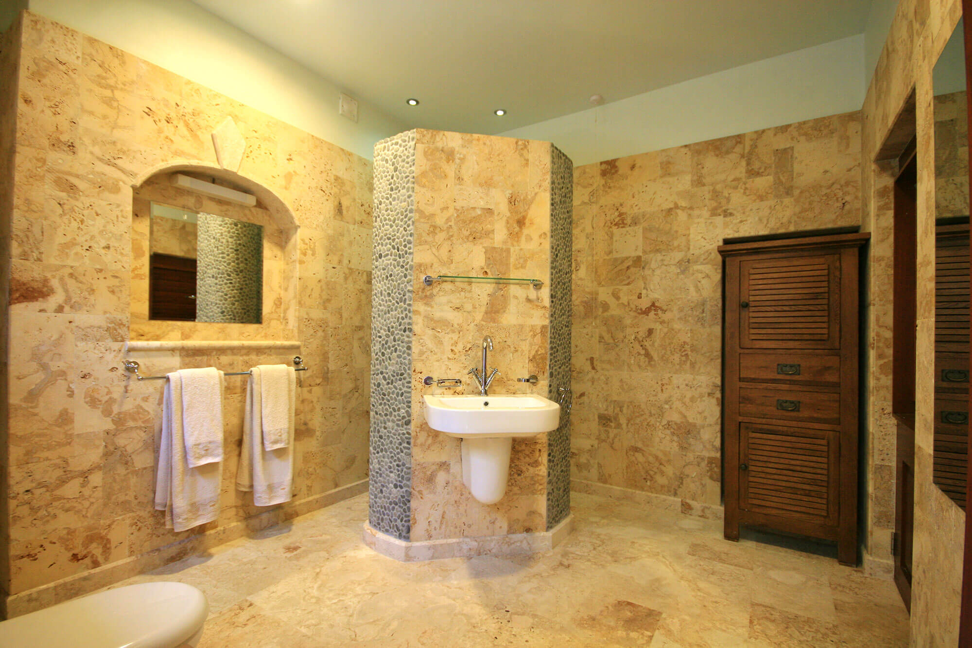 A very spacious en-suite toilet and shower room leads from the living area and this has been finished to a very high standard using natural coral stone tiles. The walk through shower is a lovely feature and is finished in natural stone pebble and coral tiles. A complimentary range of premium toiletries, organic shampoos, conditioners and soaps, together with top quality luxury bath linens, robes, pool and beach towels are all supplied.