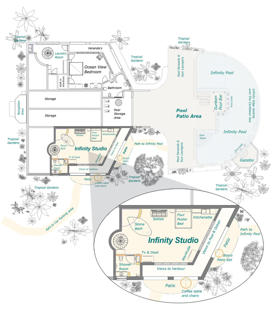 The very large Infinity edge swimming pool is just a few metres away and is often quoted as being one of the top ten pools in the Caribbean. The Infinity Pool is a stunning feature of the property and with the environmentally friendly solar heating, the pool can be enjoyed at all times of the year. Typically our daytime pool temperatures are around 33 deg C in summer and 29 deg C in winter. That’s an amazing 94 deg F falling to a very inviting 84 deg F in winter. The extra 3 degrees C created by our solar heating can make an enormous difference to your enjoyment of the pool.