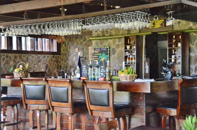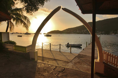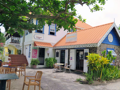 Enjoy West Indian / International food and sit on the whale vertebrae bar stools at the whale jawbone bar. Great views. Located on the Belmont Walkway between the Frangipani and the Gingerbread Hotel.